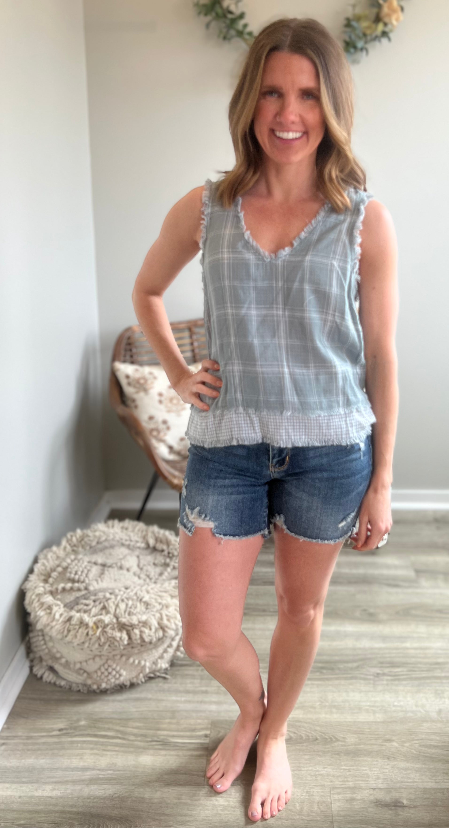 Blue and white plaid v-neck tank with distressed fringe on the edges